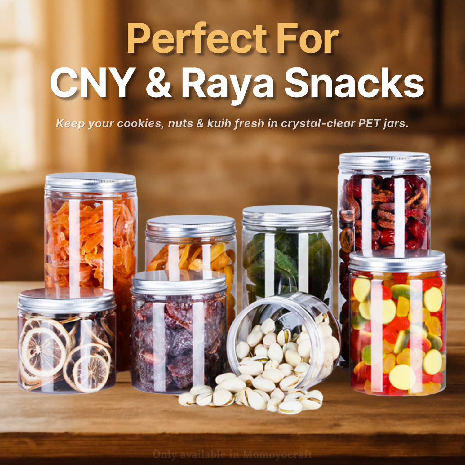 Durable, food-grade PET jars designed to keep your cookies, nuts, and kuih fresh. Ideal for hampers, gifting, and small business packaging.